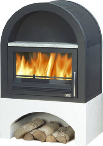 Конструкция включает в себя панорамную дверцу, через которую можно наслаждаться красотой пламени, а также часто дополняется варочными поверхностями и духовками.