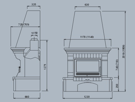 Диаметр выходного патрубка рассчитан на диаметр подключаемой дымоходной трубы в 150 мм. Дымосборник и цоколь окрашены в белый цвет. Притопочная зона выложена огнеупорной керамикой. Встроенные системы "чистое стекло" и "двойной дожиг" топлива.
