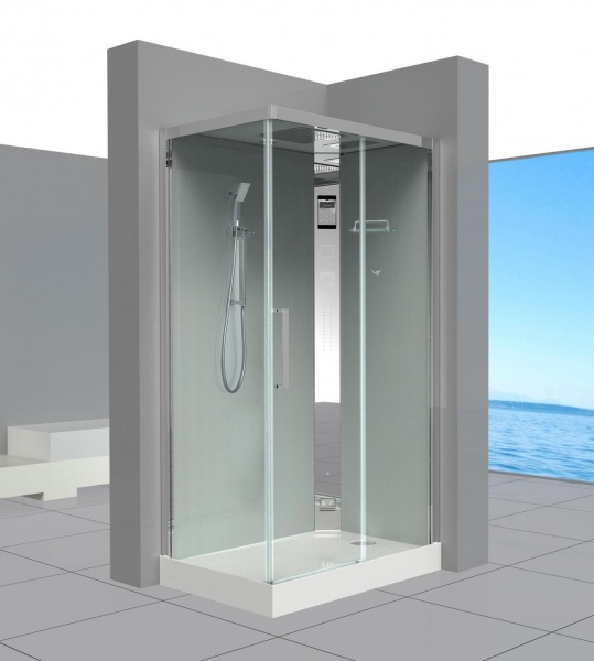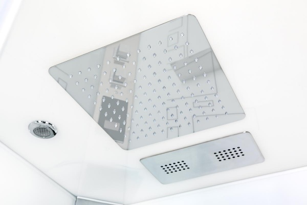 Это лаконичная прямоугольная конструкция, оснащенная парогенератором для эффекта турецкой бани, верхним изливом с эффектами мелких брызг тропического ливня или водопада. И все это настраивается с помощью простой электронной панели. Есть также радио с любимой музыкой.