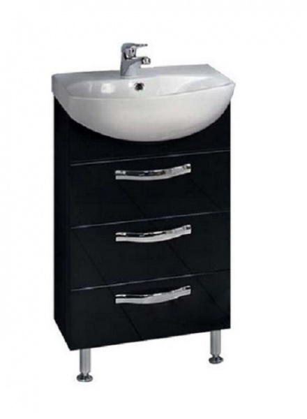 Такой вариант считается достаточно неплохим для ванной комнаты. Особых навыков по установке мебель не требует, достаточно просто поставить тумбу в отведенное ей место. Модель выполнена в черном цвете, поэтому очень практичная в эксплуатации и выглядит стильно.