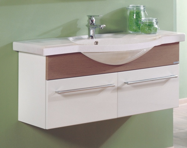 Подвесная конструкция мебели – это очень удобное решение для миниатюрных ванных комнат. Такая тумба не занимает много места и отлично вписывается в любой интерьер. Для хранения всех необходимых вещей предусмотрено два выдвижных ящика с системой плавного закрывания.