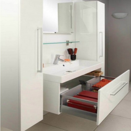 При желании интерьер ванной комнаты дополнить стеклянной полкой – под зеркалом. Двери тумбы имеют стабилизаторы для плавного и безопасного закрытия. Производитель использует древесные материалы высочайшего качества и применяет ведущие влагостойкие технологии.