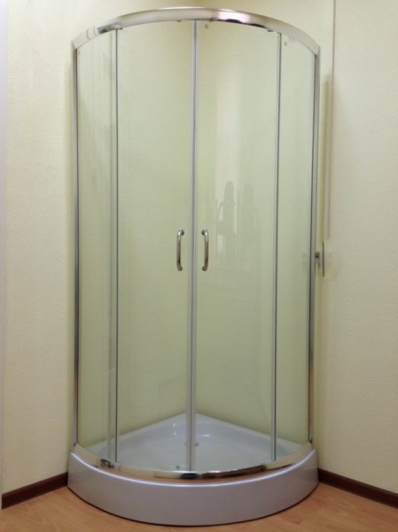 Открытый душевой уголок с поддоном, полукруглой формы, стандартных размеров 80 на 80 см, с раздвижными дверьми. Стекла закаленные, ударопрочные, безопасные, прозрачное, толщиной 0.6 см.