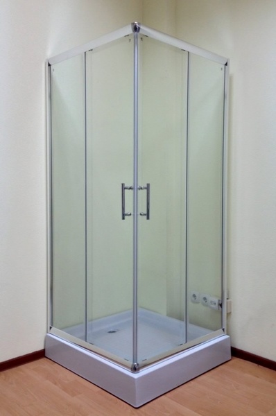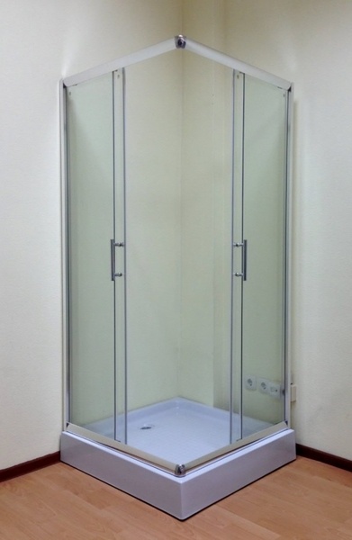 Квадратный душевой уголок AM-A-14-90 с раздвижными дверьми и хромированным профилем.