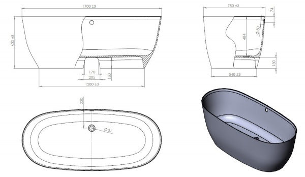 Артикул: Ванна АТРИЯ, литой мрамор 1700х750