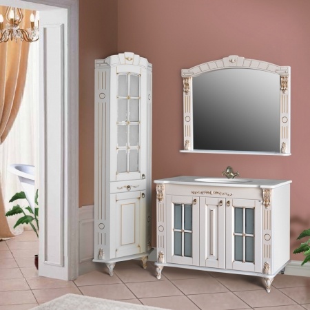 Напольный пенал Александрия dorato левый с двумя дверцам и ящиком для хранения мелочей. Модель декорирована витриной из матового стекла. Пенал подходит для набора мебели Александрия 100 dorato.