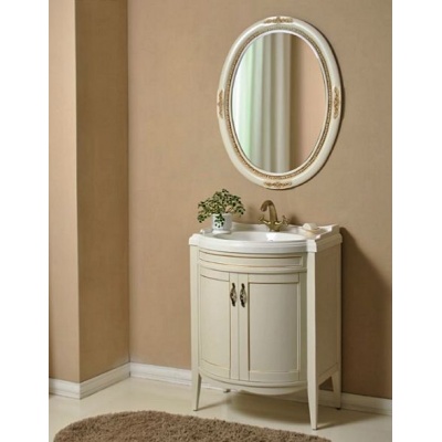 В набор входит зеркало в деревянной раме и вместительная тумба с раковиной. Эффектное сочетание цвета слоновой кости и золотистыми оттенками делает такую мебель очень элегантной и заметной. Изготовлена она из массива дерева, поэтому прослужит долго и безукоризненно.