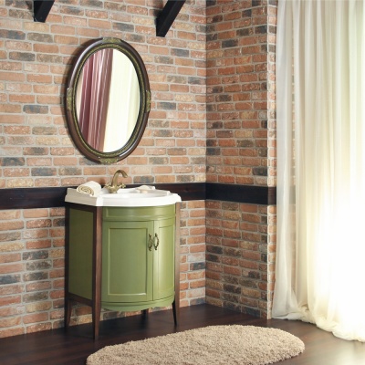 В набор входит зеркало в деревянной раме и вместительная тумба с раковиной. Эффектное сочетание зеленого цвета с золотистыми оттенками делает такую мебель очень элегантной и заметной. Изготовлена она из массива дерева, поэтому прослужит долго и безукоризненно.