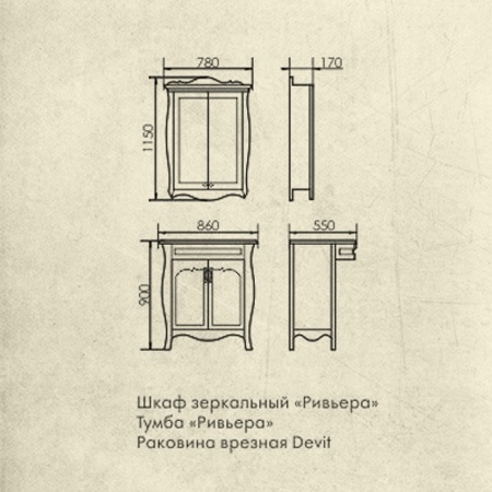 Комплект "Ривьера" - это сочетание романтизма и необычайного удобства, комфортности и визуальной привлекательности. Мебель отличается элегантностью, характеризуется наличием изогнутых ножек и резных элементов. Комплект включает в себя зеркальный шкаф и тумбу со встроенной в нее раковиной.Вовсе не обязательно ехать в Париж, чтобы насладиться элегантностью и шиком, которые являются неизменным спутником этого популярного стиля искусства декора.Этот стиль привлекает, прежде всего, своей простотой и очарованием старины.Помимо своей красоты, комплект "Ривьера" отличается еще и функциональностью. Как в зеркальном шкафу, так и в тумбе присутствуют полочки, на которых прекрасно можно разместить все банные принадлежности. Для покраски используется краска «Italcolor» производства Италии, благодаря которой мебель обладает повышенной влагостойкостью и сопротивляемостью к внешним воздействиям. При производстве зеркала используются зеркальные полотна производства Бельгии с амальгамой на основе серебра, которые обладают рядом преимуществ: идеальное качество отражения, влагостойкость и устойчивость к агрессивным средам, долговечность - со временем не тускнеет и не образует пятен на поверхности.