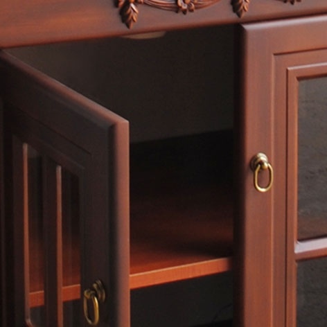 В набор входит прямоугольное зеркало в деревянной раме, а также тумба с раковиной и небольшой столешницей из искусственного камня. За распашными дверцами с витражами скрыты вместительные полочки, на которых можно с комфортом расположить необходимые вещи.