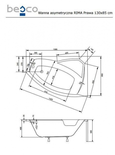 Угловая акриловая ванна Besco Rima 130x85 P - Характеристики