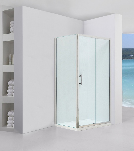 Душевой уголок Stellar Wind S108 прямоугольной формы из прочного закаленного стекла с раздвижной дверью и двумя фиксированными стеклами.
