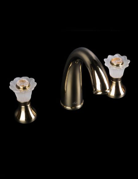 Смеситель для раковины 297-Camelia на 3 отверстия монтажа из латуни с золотым покрытием. Конструкция двухвентильного управления с вентилями из хрусталя в виде цветков.