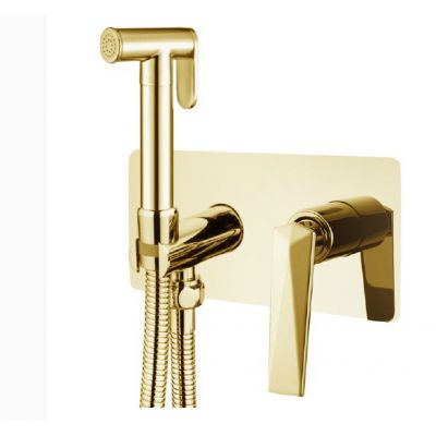 Гигиеническая лейка со смесителем Venturo 387 из латуни в золотом исполнении. Конструкция встраивается в стену и имеет однорычажное управление.