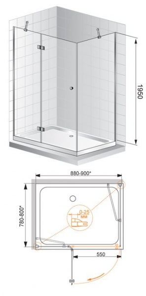 Исполнение металлических деталей Cr (хром), тип стекла C (прозрачное) или P (Punto). Может комплектоваться поддонами типа AH или барьером из искусственного мрамора типа В. Поддон и барьер приобретаются отдельно.