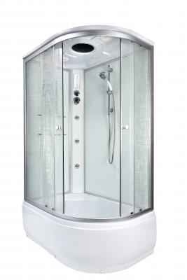 Асимметричная душевая кабинка ЕМ4512 L с раздвижными дверьми, высоким поддоном, гидромассажем и электрикой.