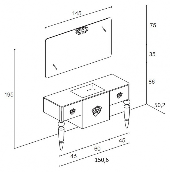 | Размер тумбы (ШхГхВ): | 150 см х 50 см х 86 см |