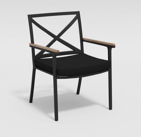 Каркас мебели выполнен из всесезонного алюминия с порошковым покрытием темно-серого цвета (карбон), подлокотники стульев декорированы вставками из тика, подушки сидений обшиты уличной тканью черного цвета (А13814) с водоотталкивающей пропиткой, толщина подушек 5 см, столешница обеденного стола изготовлена из тика.