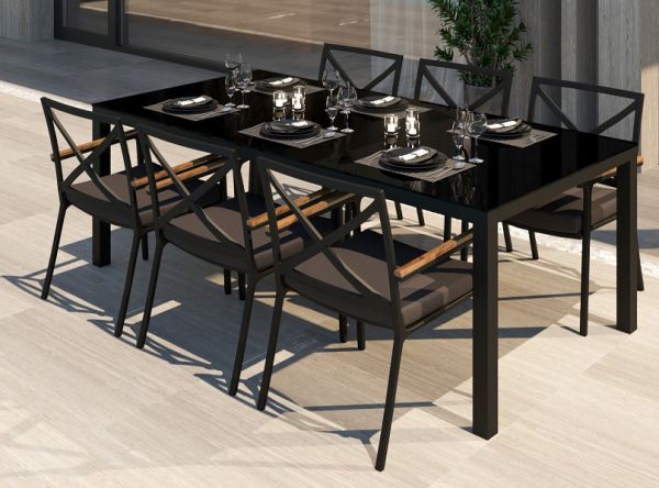 Каркас мебели выполнен из всесезонного алюминия с порошковым покрытием темно-серого цвета (карбон), подлокотники стульев декорированы вставками из тика, подушки сидений обшиты уличной тканью темно-серого цвета (А13805) с водоотталкивающей пропиткой, толщина подушек 5 см, столешница обеденного стола глянцевая, изготовлена из закаленного стекла толщиной 5 мм с нанесением черного цвета с помощью шелкотрафаретной печати.