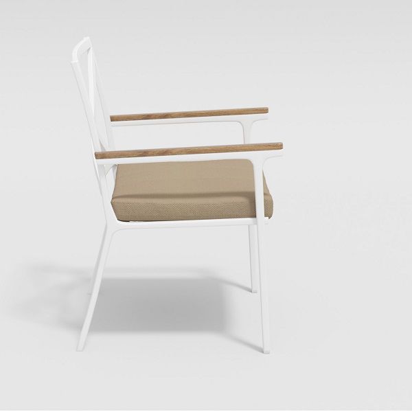 Обеденный стул "Calma" можно приобрести как по отдельности, так и в составе обеденной группы. Каркас стула выполнен из всесезонного алюминия с порошковым покрытием белого цвета, подлокотники стульев декорированы вставками из тика, подушки сидений обшиты уличной тканью бежевого цвета с водоотталкивающей пропиткой, толщина подушек 5 см.