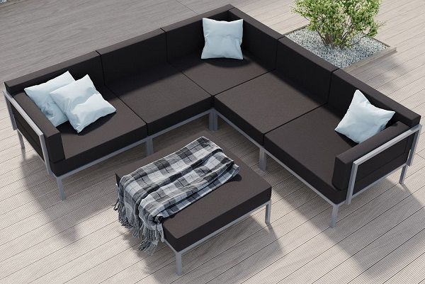 Каркас мебели выполнен из всесезонного алюминия с порошковым покрытием серебристого цвета, подушки спинок и сидений обшиты уличной тканью черного цвета с водоотталкивающей пропиткой, толщина подушек 12 см.