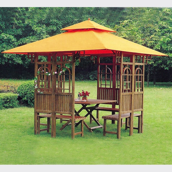 Легкая деревянная беседка выполненная из массива дерева, пропитанного специальным влагозащитным составом. В комплект входит деревянный обеденный стол и скамейки
