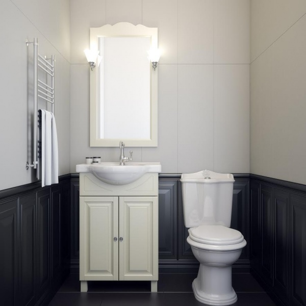 Предусмотрено и место для хранения ванных принадлежностей – полочки за распашными дверцами. Если этого недостаточно, то можно дополнительно приобрести напольный шкафчик. В стандартную комплектацию также входит зеркало в деревянной раме с двумя светильниками.