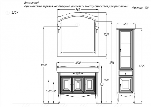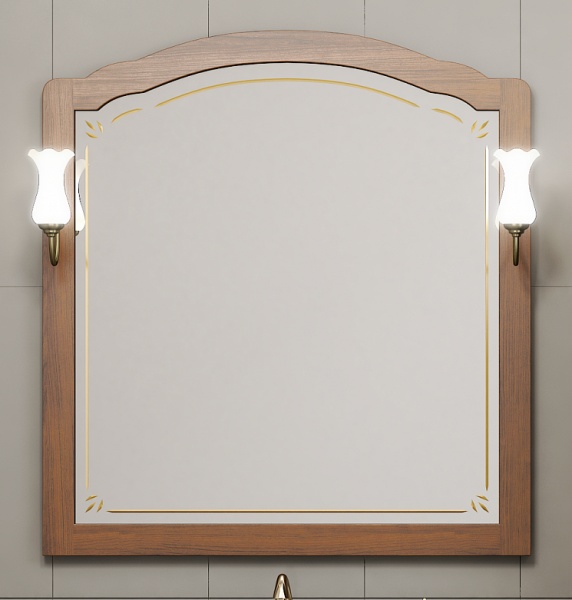 А именно – тумбу с раковиной, которая необходима в процессе ежедневной гигиены. В ней есть как полочки за распашными дверками, так и вместительный выдвижной ящичек для хранения всяких мелочей. Зеркало обрамлено деревянной рамой и предусматривает красивую подсветку.