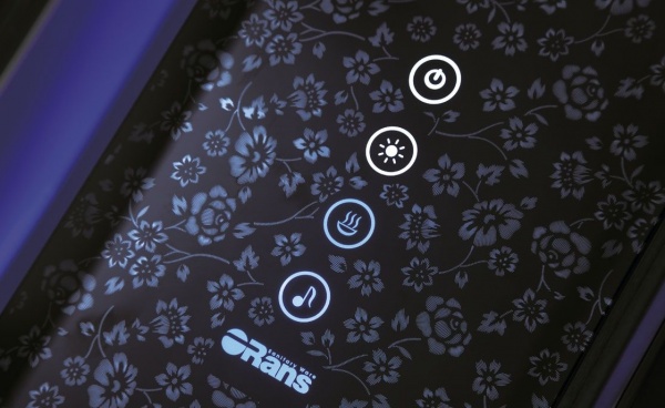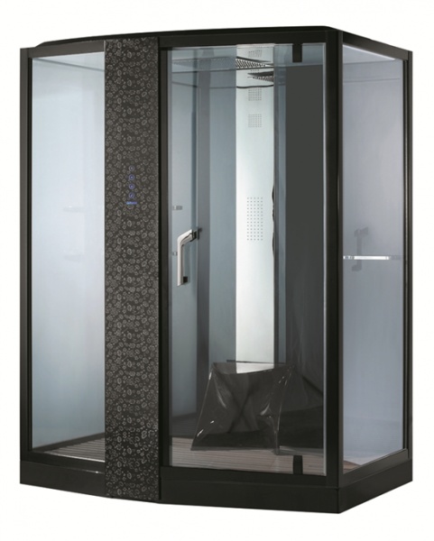 Быстрая безсиликоновая сборка, упрощенный доступ к блокам управления и сифону, сенсорные кнопки встроены в колонны, черный акриловый поддон, подсветка через крышу лампами дневного света, растительный орнамент на лицевой стороне колонны - Задние стекла тонированные, остальные прозрачные, толщина всех стекол 6 mm, распашная дверь | |