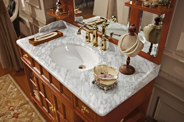 Здесь есть полочки для хранения всех необходимых ванных принадлежностей и средств личной гигиены, которые необходимо правильно разместить и скрыть от посторонних глаз. Особенное очарование дизайну модели придает изысканная металлическая фурнитура.