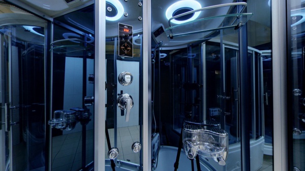 С ее помощью вы можете управлять гидромассажем, радио, подсветкой и вентиляцией. Дверцы выполнены из ударопрочного закаленного стекла толщиной 5 мм. Такое стекло безопасное – его невозможно разбить случайным ударом.