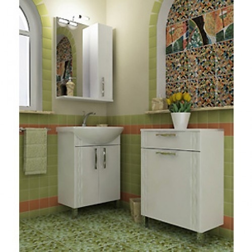 Модель выполнена в стильных светлых расцветках, поэтому идеально смотрится рядом с любой сантехникой и мебелью в ванной комнате. За распашными дверцами скрываются вместительные полочки, на которых поместятся все необходимые в ежедневном быту ванные принадлежности.