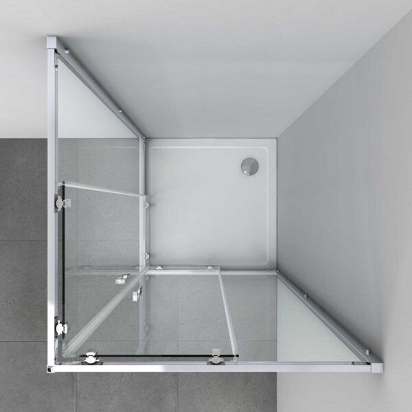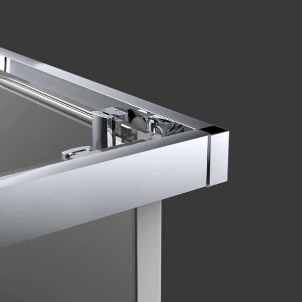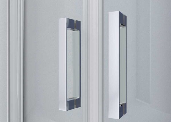 Душевой уголок размера 1000*1000, направляющие из хрома, со стеклом 6 мм. Две двери, раздвижные, ширина входа - 560 мм.