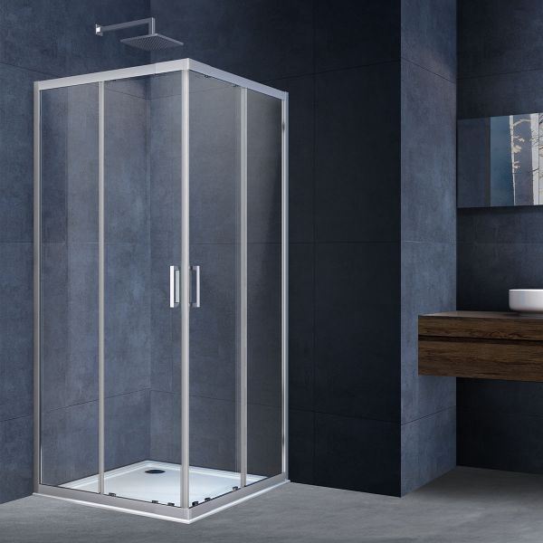 Душевой уголок размера 800-900×800-900, направляющие из хрома, со стеклом 6 мм. Две двери, раздвижные, ширина входа - 350-490 мм. Расширенная регулировка 120мм за счет специальной конструкции телескопического профиля.